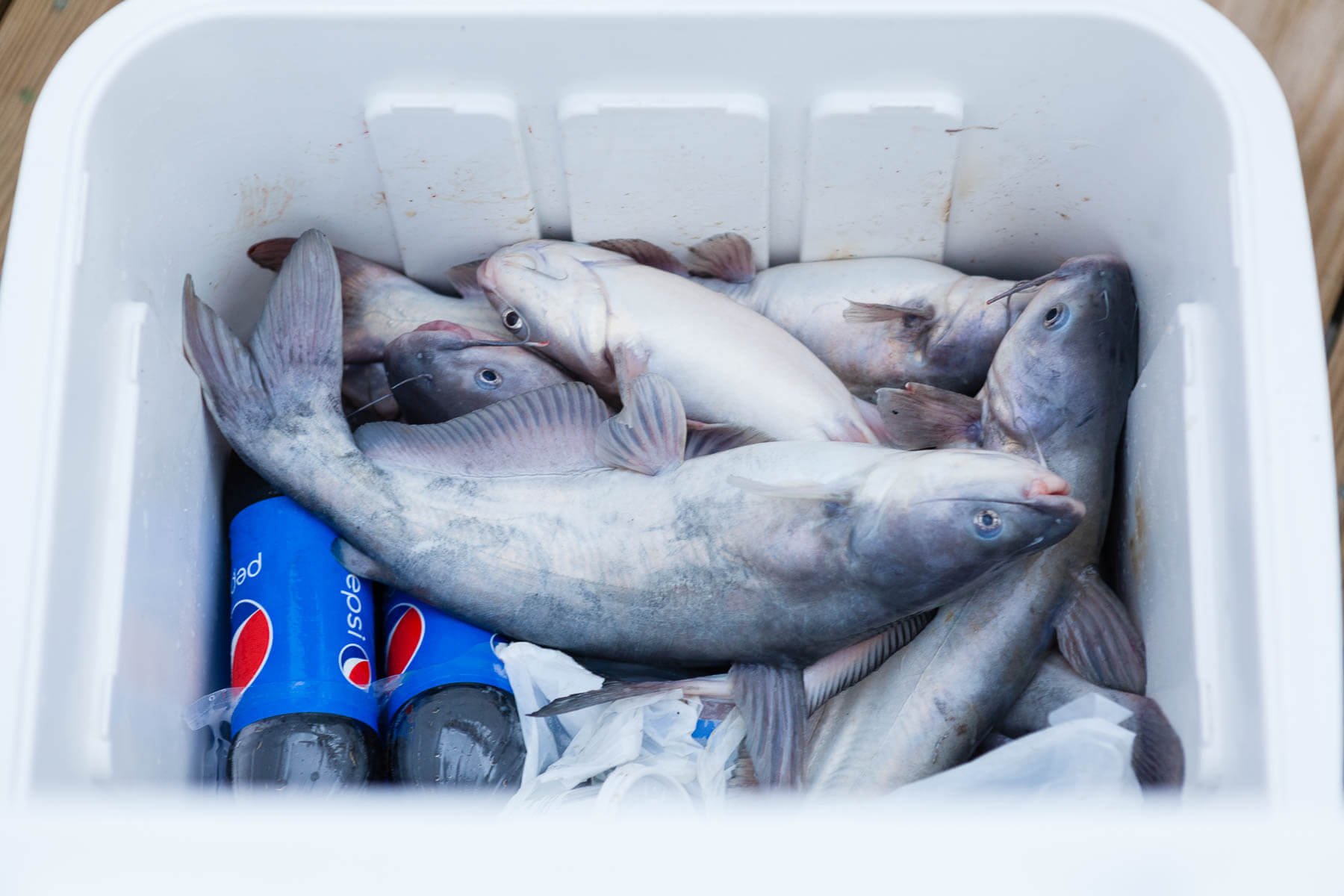 The blue catfish is a long fish with a slate blue body and deeply forked tail. Though they average two feet in length, they may grow up to five feet. The oldest blue catfish on record, found in Virginia’s Rappahannock River, was 25 years old. Blue catfish are native to the Mississippi, Missouri and Ohio river basins. Between 1974 and 1985, they were stocked in the James, Rappahannock and York Rivers in Virginia for recreational fishing.