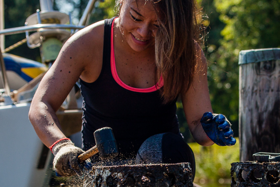 On September 23, 2016, volunteers from Price Waterhouse Cooper went through the labor intensive, muddy but important work of emptying the almost 200 buckets hanging from a private marina dock in Flood’s waterfront Annapolis neighborhood. Busy dislodging oysters from their first homes with a combination of sledge hammers and vigorous shaking, they were careful to allow the fish, eels and crabs that made their home in the buckets to evacuate. Once free, the oysters were ferried to their new homes on the South River sanctuary reef.