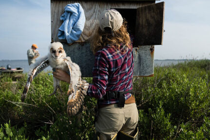 Found throughout the Chesapeake region, barn owls are solitary predators that help control populations of rats and other pests. Though wild barn owls have been known to live as long as 32 years, the mortality rate early in life is quite high, leaving the species with an average lifespan of only two to four years. As with many animals, the young are more susceptible to predation than the adults, but this isn’t the only challenge barn owls have to overcome.