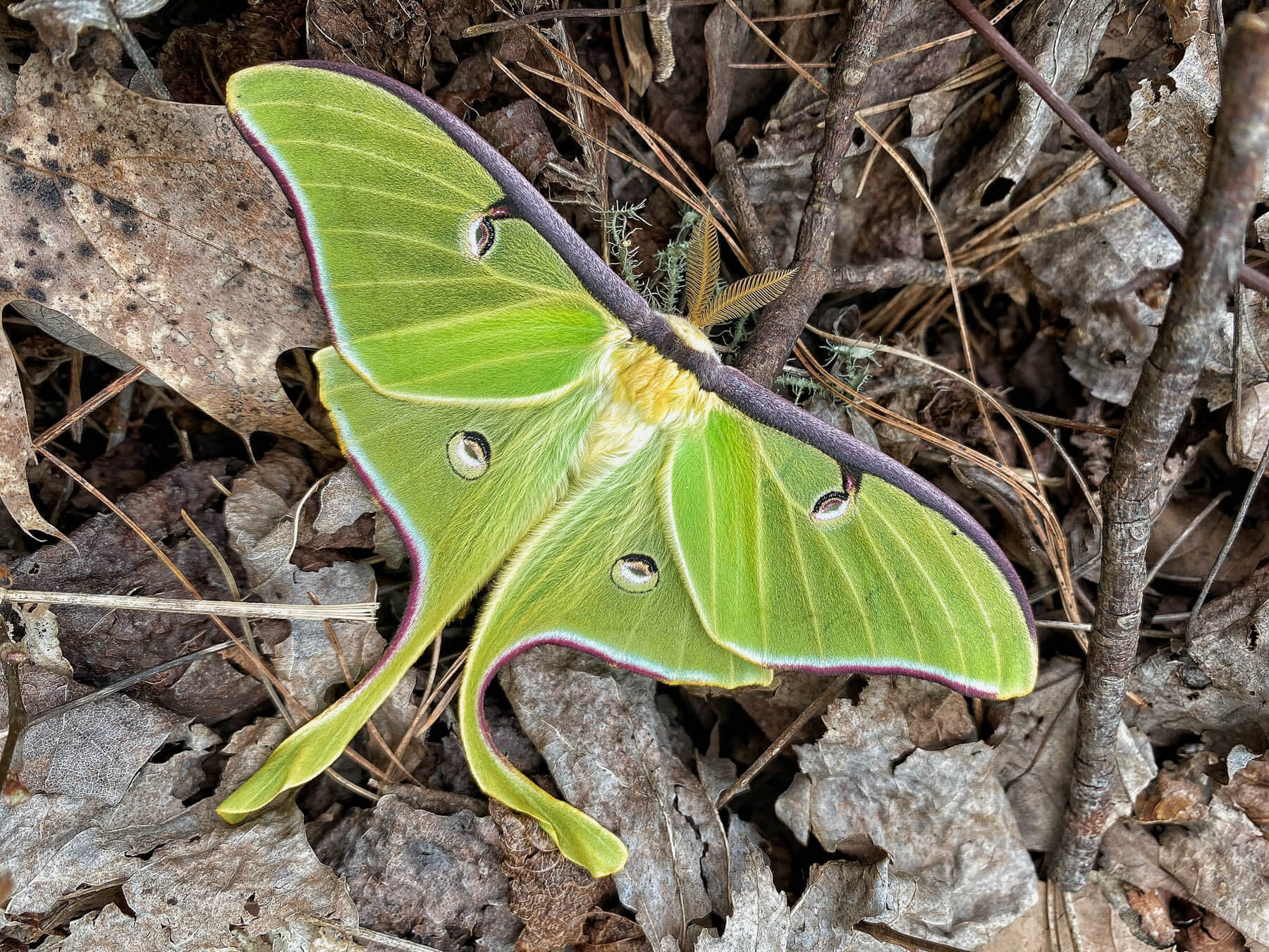 The long, fluttery-tailed and softly green luna moths start their life journey in a cocoon buried under fallen leaves. Adult luna moths find each other with pheromones and then lay eggs on a selection of host trees that include persimmons, white birch, hickories and sweet gums. After feasting, the caterpillars spin papery brown cocoons that fall into the leaf litter. There in the fallen leaves, the luna remains and grows to its beautiful adult form. Also known as “American moon moths,” the stunning lunas are a favorite snack of bats.