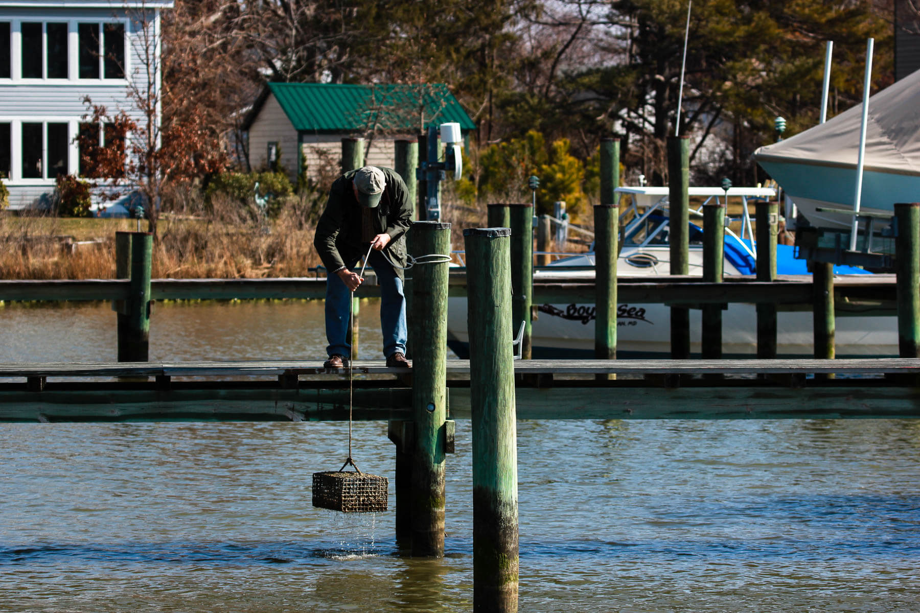 Oyster cages right off the pier become micro reefs of an interconnected system, and that diverse network is mirrored in the people who care for the oysters in that crucial first year. In addition to the growers and departments, the hatchery at UMCES Horn Point Laboratory produces the spat for the program. Several watermen across local waterways are closely involved, pitching in with their boats and equipment to help neighbors when the nine months are up and it is time for oysters to be transported to their local sanctuary. Thousands of schoolchildren across the tributaries take up the call to tend the cages, which require shaking several times a week to ensure silt does not stress the young oysters.
