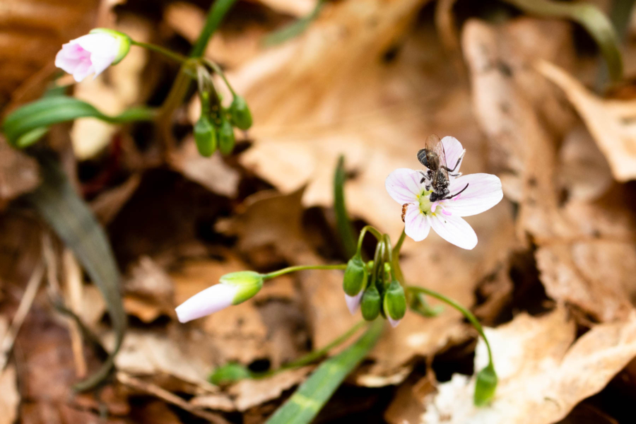 As hungry larvae from the spring beauty miner bee begin developing inside of their nest, they almost exclusively feed on pollen taken from spring beauties. Females gather pollen from the flowers and package them into balls that they stuff into the part of the beehive where larvae live. Larvae consume the pollen, and emerge from the nest as adults in early spring, at the same time the spring beauties start to blossom. In the Chesapeake region, the native spring beauty is the Virginia spring beauty, which boasts beautiful soft pink flowers and can work well in a yard or garden.