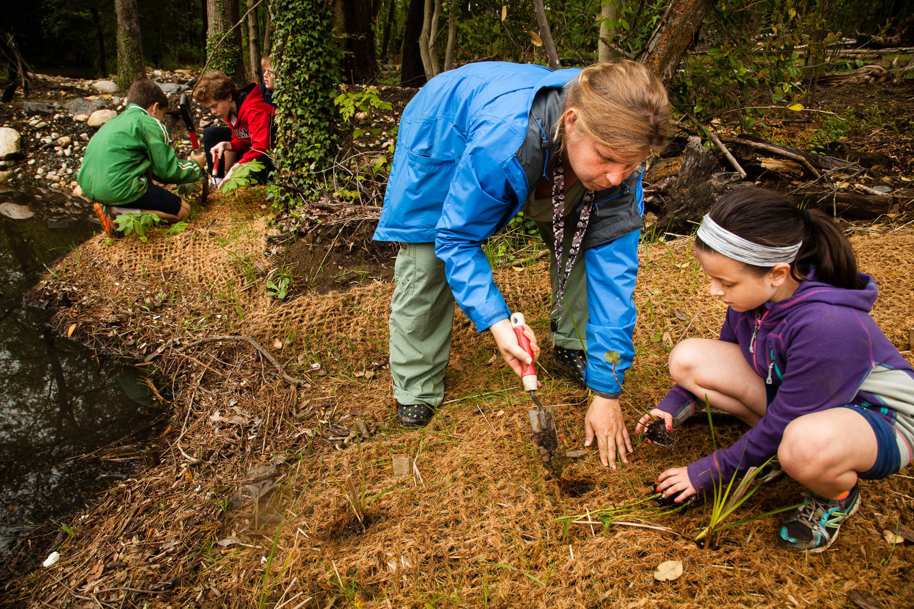 Nancy Merrill from South River Federation shows a student how to plant a bur-reed at a restored wetland on Church Creek in Annapolis, Md. This project won second place in the 2017 Best Stream Restoration BUBBA. (Photo by Will Parson/Chesapeake Bay Program)