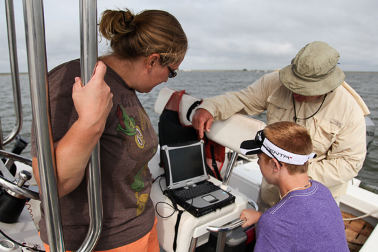 During the months of May, July and September, biologists like Chris Guy, who works with USFWS, visit randomly selected sample sites throughout the Bay. Occasionally accompanied by volunteers, their mission is to track the ebb and flow of underwater grass beds in order to gauge the health of the Bay.