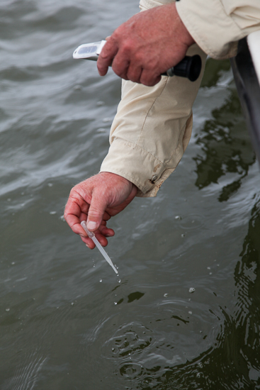 Once a sampling site is reached, researchers use a refractometer to determine the salinity of the water. Different bay grass species prefer different salinity levels, and this measurement gives biologists a hint as to what kind of grasses they should expect to find.