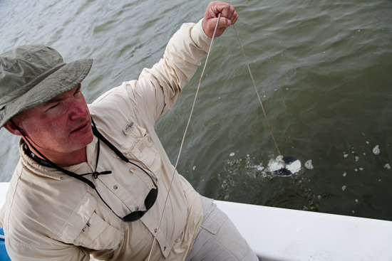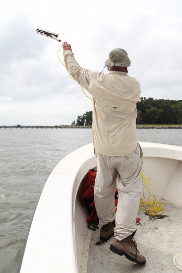Once the salinity and turbidity are measured, a rake is tossed into the water and allowed to sink to the bottom.
