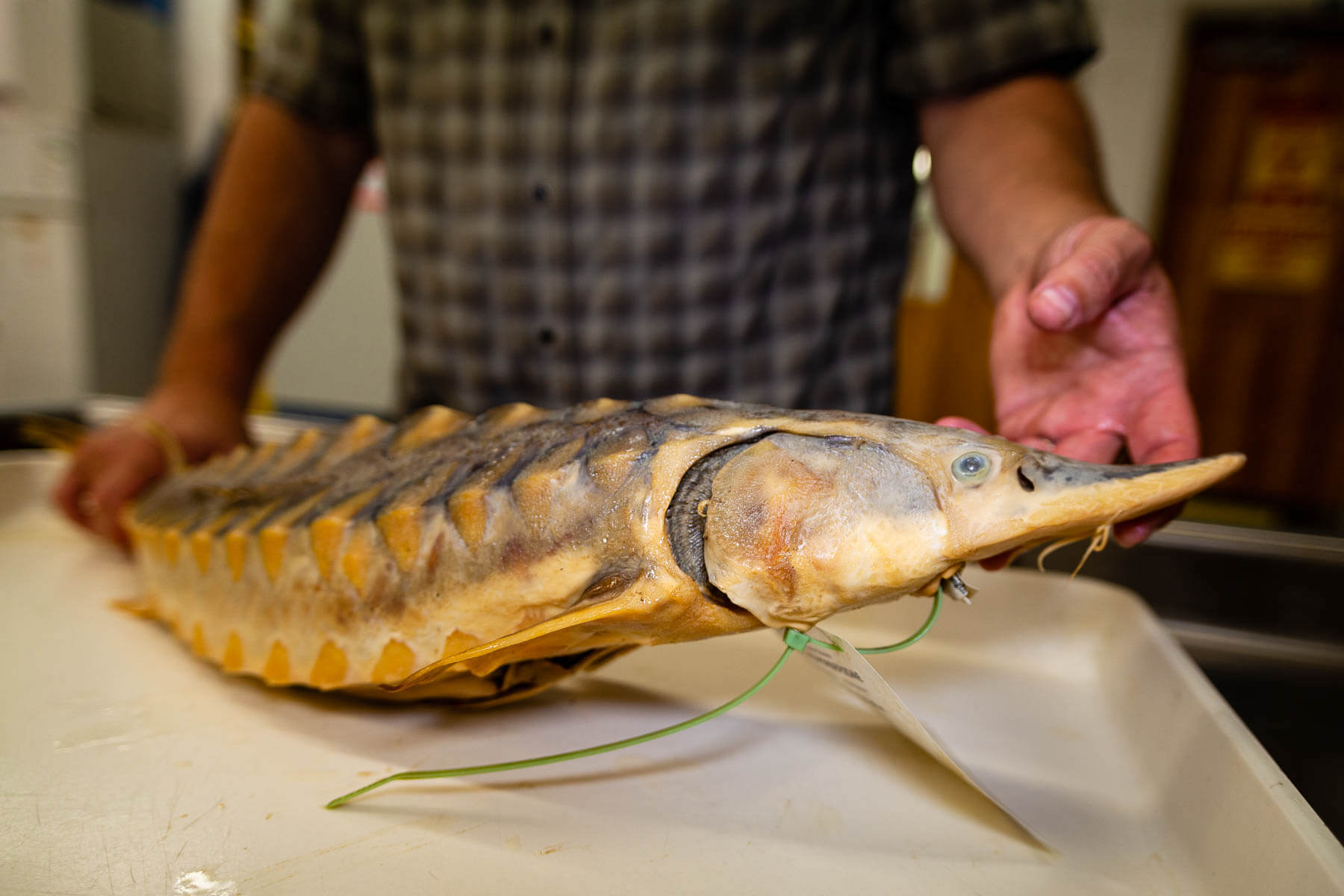 The preservation process starts with the euthanization of the fish. Then, the specimen is soaked in a formalin bath to prevent tissue decay and breakdown.