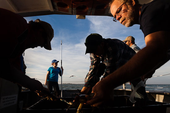 From right, Phill Rodbell of the U.S. Forest Service, Adam Miller of the Maryland Department of Natural Resources and Phil DeSenze of the U.S. Forest Service sort blue crabs caught with crab pots on the waters near Smith Island, Md., during a demonstration on the Chesapeake Bay Foundation’s boat.