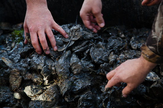 After learning some of the history of the oyster industry on Smith Island from native waterman Wes Bradshaw, foresters sort through a muddy pile of oysters and oyster shells dredged from the water.