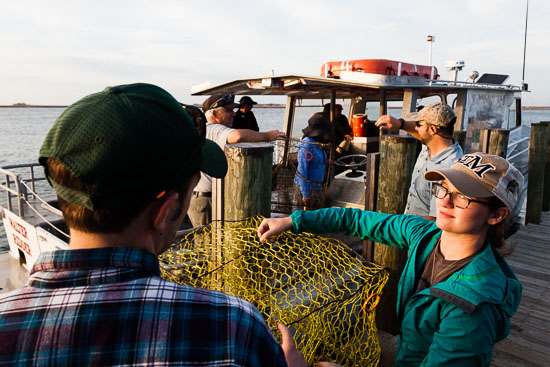 Payton Brown of the Alliance for the Chesapeake Bay hands a crab pot to Adam Miller of Maryland Dept. of Natural Resources while unloading the Chesapeake Bay Foundation's boat.