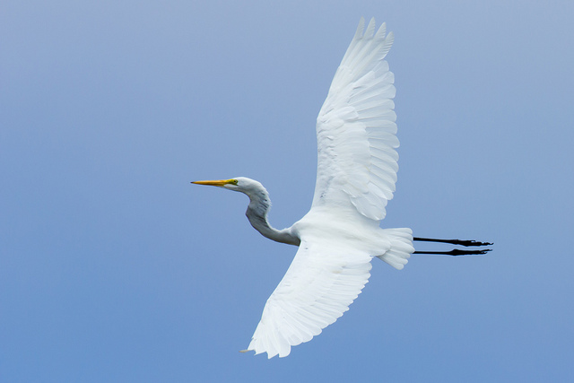 Snow geese and tundra swans breed in the Arctic, travel down the Atlantic flyway and overwinter along the Bay. Although the white birds may look alike at first glance, snow geese are smaller and stouter and travel in large flocks. Tundra swans, on the other hand, are larger birds with long necks and black bills. Both species can be seen near open water or blanketing agricultural fields while foraging for food.