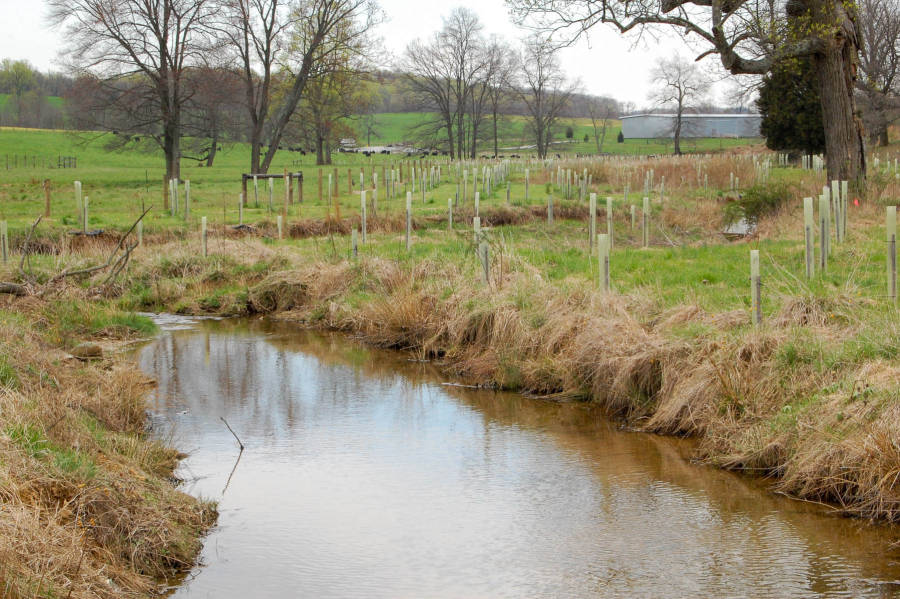 Planted trees form a riparian forest buffer at Soper Farm in Westminster, Md., on April 24, 2009. Attendees of last week's Chesapeake Bay Agricultural Networking Forum discussed restoration successes and failures. (Photo by Alicia Pimental/Chesapeake Bay Program)