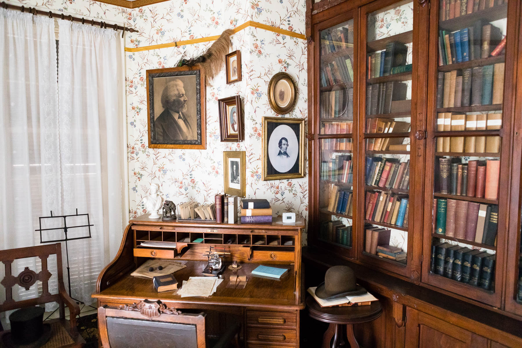 While his library gives an impression of his studious nature, his personal effects also hint at his rich personal life. The hat to the right of his desk occasionally concealed ribbons and braids, which his granddaughters would weave into his hair. He surrounded himself with photographs of friends and those he admired as he passed long hours in his library. The gold frame directly above his books holds the photo of his lifelong friend, abolitionist and author William Lloyd Garrison.
