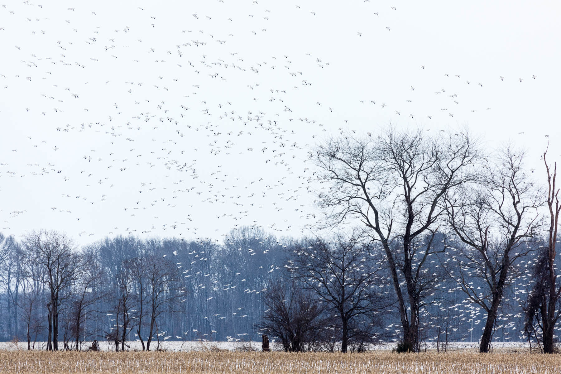 Thousands of snow geese land in a farm field on a January day in Queen Anne's County, Md. Snow geese are flock-forming herbivores who enjoy grains and grasses. (Photos by Will Parson/Chesapeake Bay Program)