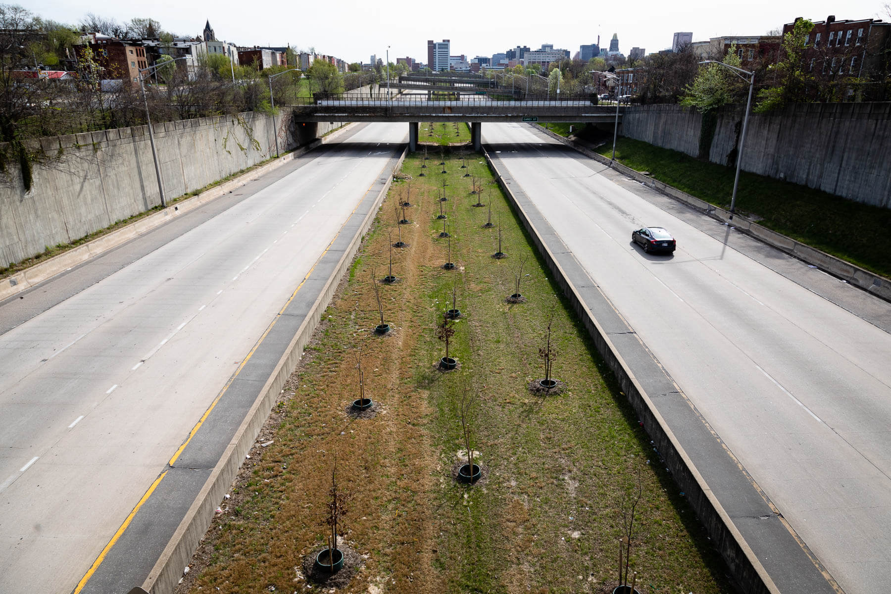 Through this planting project, Blue Water Baltimore also aimed to impact a place with a complicated history. In the mid-1900s, this neighborhood was targeted for development to extend Interstate 70. What is now a 1.4-mile, six-lane stretch of U.S. Route 40 used to be home to more than 1,000 residents, most of whom were African-American. They were replaced by the “Highway to Nowhere,” which was abandoned in the 1980s due to public opposition.