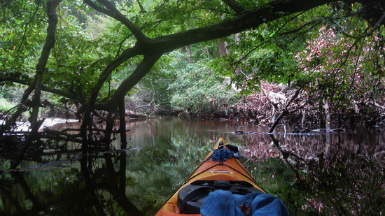 As Tuckahoe Creek narrows, tree branches form a canopy over paddlers.