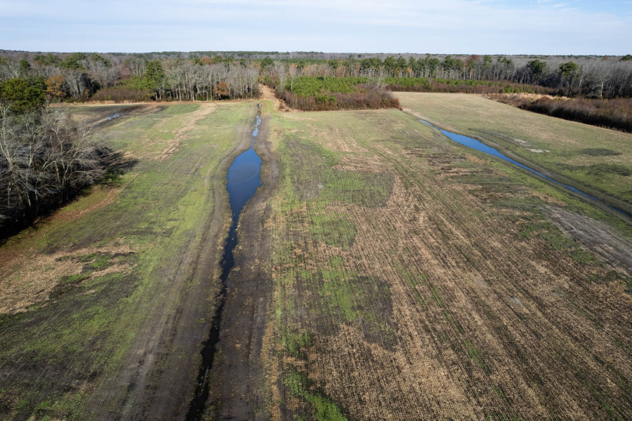 Construction on the property lasted from September to October 2023. As a farm field, the site had a handful of narrow irrigation ditches meant to drain the land after rain. Jennings worked with engineers to flatten out these long ditches to function as swales, which are slightly sloping, sunken areas natural to a wetland. On those same ditches, engineers put in “ditch plugs” that fill previously empty pockets of land to improve hydrology. At the end of the swales, the team also put in three impoundments. These are small, pond-like features that are natural to a wetland and provide a variety of insect life for waterfowl to feed on.