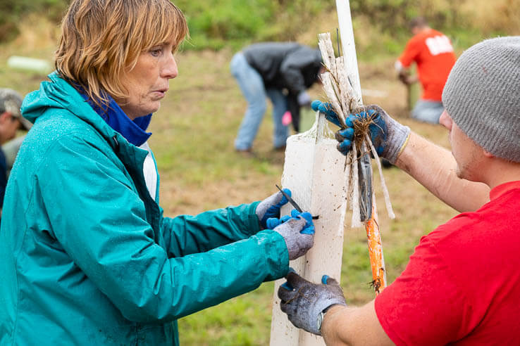 As a drizzling rain gained strength, small groups fanned out along a small stream that feeds the Juniata River, to plant 400 trees and shrubs in several long rows. The work lent itself to getting wet and muddy, but also provided ample time for conversations to take root before everyone sheltered under tents for a small graduation ceremony.