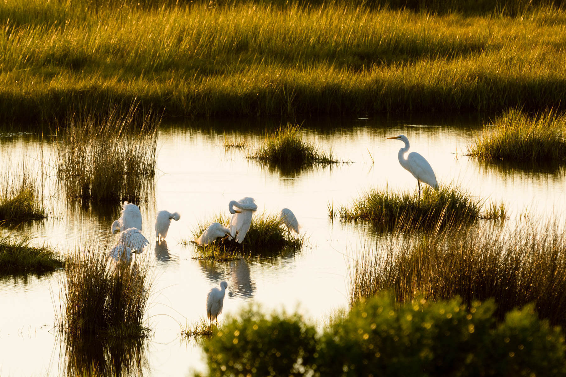Wetlands are one of several wildlife habitats that are critical to the Chesapeake Bay ecosystem. They are home to various plants and wildlife, including great egrets pictured here. (Photo by Will Parson/Chesapeake Bay Program)