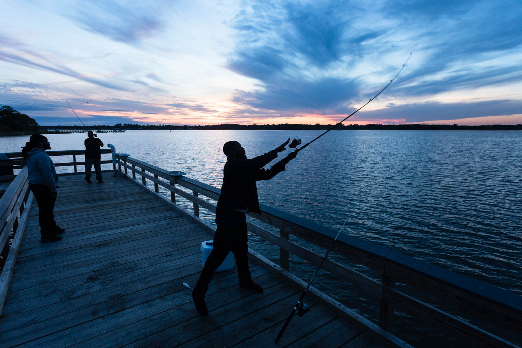 John Rogers of Suffolk, Va., fishes for croaker from the Nansemond River at Sleepy Hole Park in Suffolk on May 9. The park added the fishing pier along with an accessible kayak launch in 2016. (Photo by Will Parson/Chesapeake Bay Program)