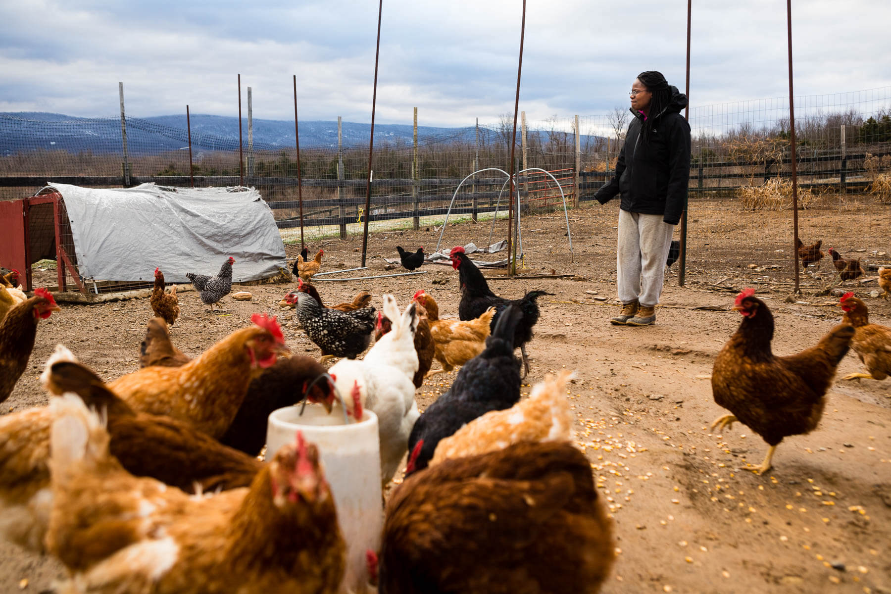 Gale Livingstone feeds chickens at Rainbow Hill Farm, her 19.5-acre certified organic farm in Jefferson County, W.Va., on Feb. 9. Livingstone moved from D.C. in 2010 and now sells produce and eggs through community supported agriculture. (Photo by Will Parson/Chesapeake Bay Program)