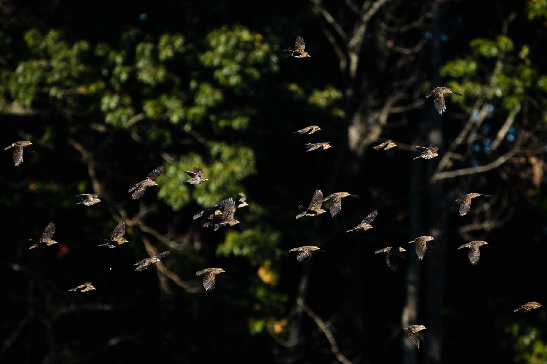 A flock of blackbirds takes off from a pond in front of woods at Logan Hill Nature Preserve in Candor, N.Y., on Oct. 1. Landowners Betsy and Dick Darlington donated the 285 acres of conserved land to the Finger Lakes Land Trust in 2015. (Photo by Will Parson/Chesapeake Bay Program)