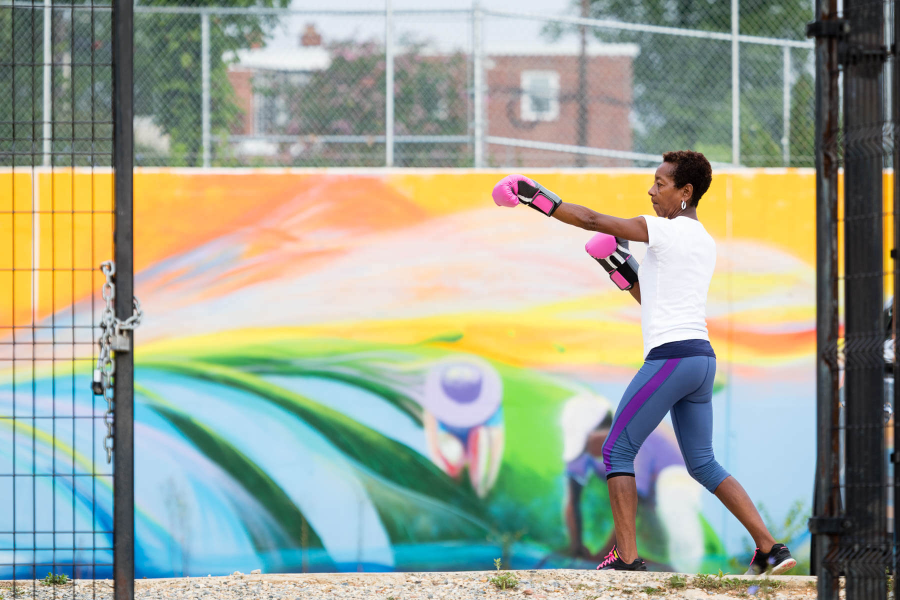 Andrea Christie of Washington, D.C., exercises during a self defense class in front of a mural at East Capitol Urban Farm in Washington on July 27. The three-acre farm features dozens of community garden beds, an aquaponics system, a rain garden and community art. (Photo by Will Parson/Chesapeake Bay Program)