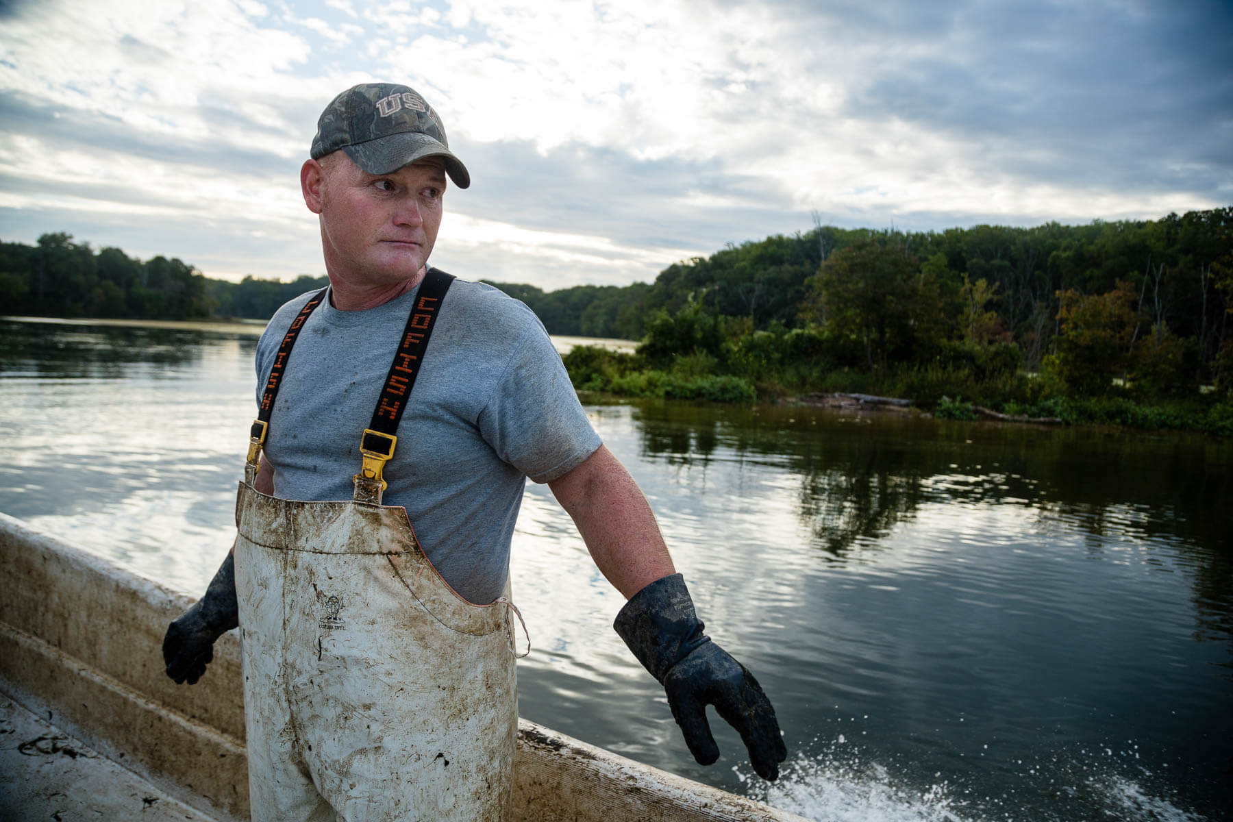 Fourth generation waterman Rocky Rice checks fish pots on the Potomac River in Charles County, Md., on Sept. 207. Rice can catch up to 1,200 pounds of blue catfish, an invasive species. Rice has increased the time he spends catching them—three days a week—as market demand has increased. (Photo by Will Parson/Chesapeake Bay Program)