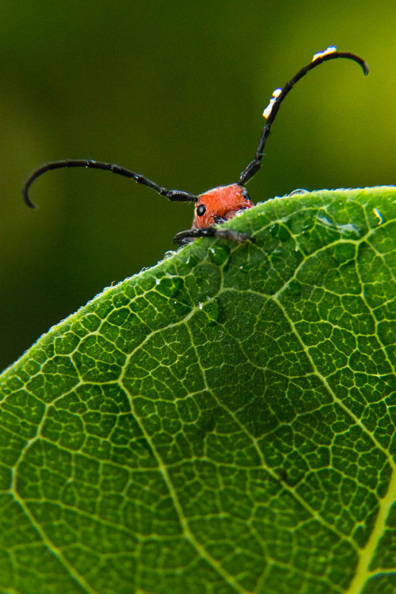 Red milkweed beetles feed on common milkweed in Annapolis, Md., on June 19. Red milkweed beetles emerge from milkweed roots in early summer and feed on milkweed leaves, flowers and buds. Like monarch butterflies, these long-horned beetles take on the toxic properties of milkweed, making their striking colors a warning to would-be predators. (Photo by Will Parson/Chesapeake Bay Program)