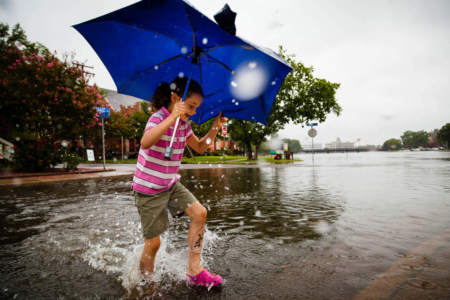A child plays in nuisance flooding—a phenomenon commonly associated with tides instead of weather— near the Chrysler Museum of Art in Norfolk, Va., after heavy rainfall on July 29. Climate change and land subsidence have combined to make Norfolk second only to New Orleans in terms of population size threatened by sea level rise. (Photo by Skyler Ballard/Chesapeake Bay Program)