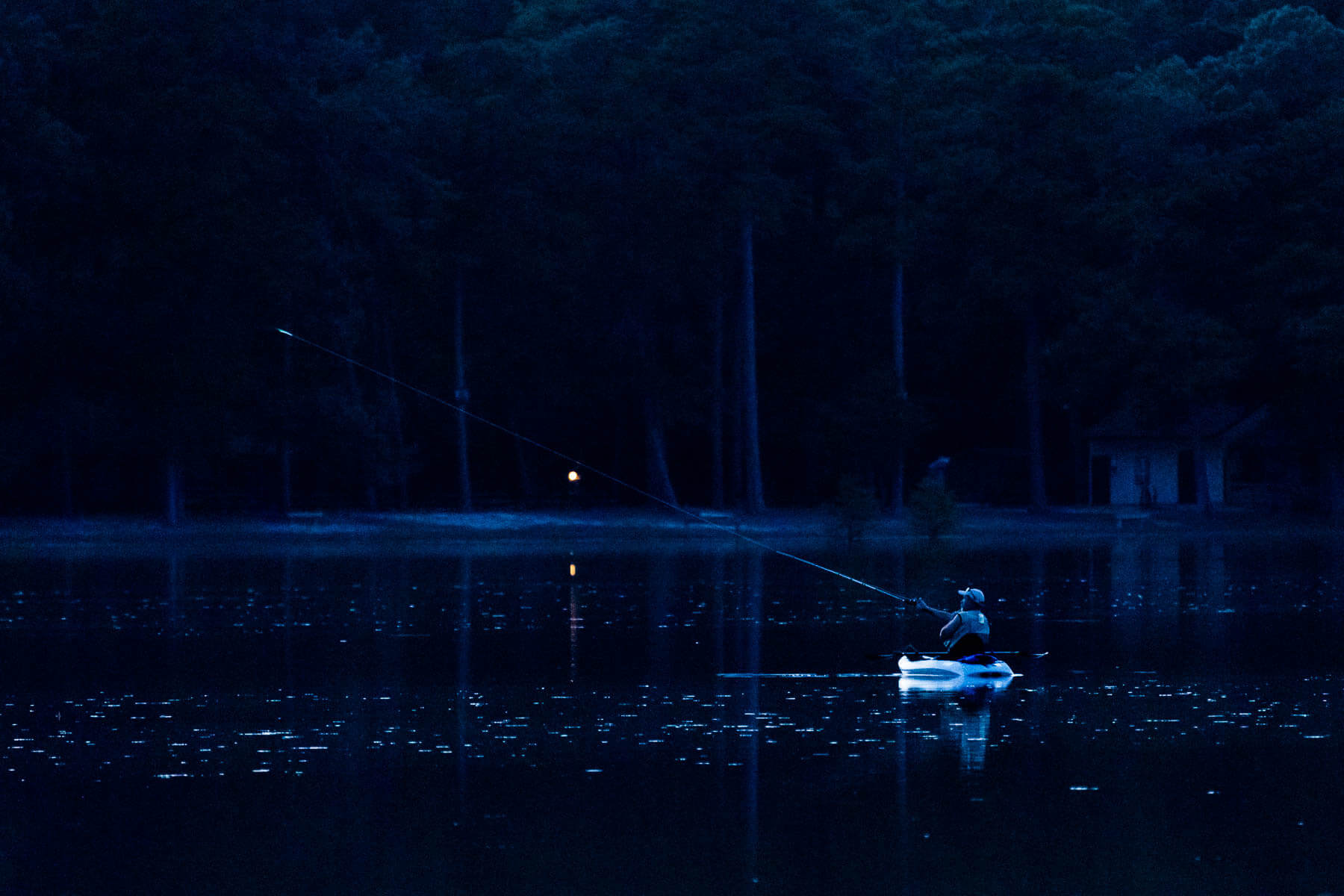 A man casts his fishing line during twilight at Trap Pond State Park in Sussex County, Del., on Oct. 6. The park holds remnants of a vast cypress swamp that covered 50,000 acres of southern Delaware before colonial times. (Photo by Will Parson/Chesapeake Bay Program)