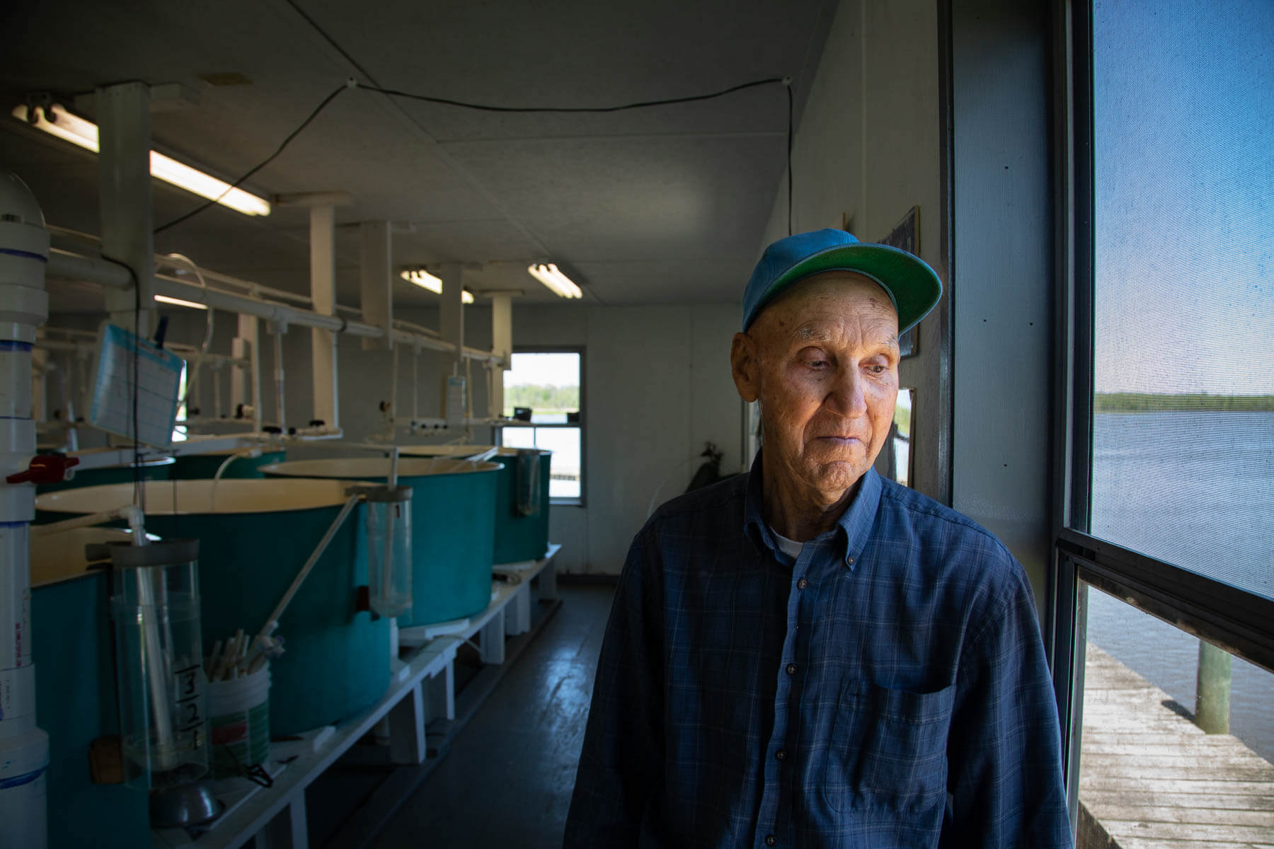 John Henry, 89, stands inside the Pamunkey Shad Hatchery on the Pamunkey Indian Reservation in Virginia on April 30, 2018. Henry is in charge of the hatchery, which has operated since 1918 on the Pamunkey River. In 2018 the hatchery was not active because not enough American shad were present in the river to be caught. (Photo by Will Parson/Chesapeake Bay Program)