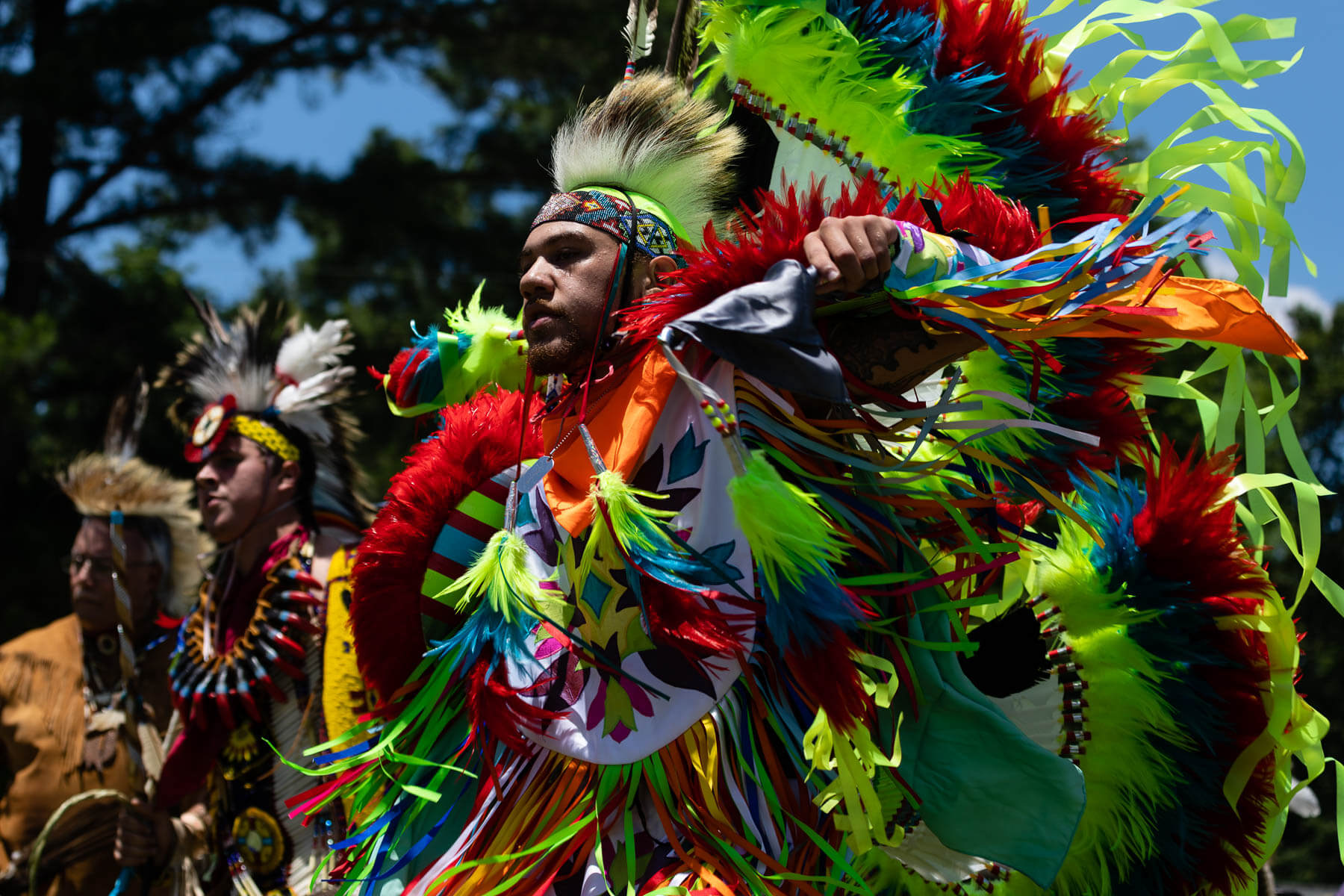 Brandon Adkins dances a crow hop during the Mattaponi Pow Wow on the Mattaponi Reservation in King William County, Va. on June 16, 2018. (Photo By Kaitlyn Dolan/Chesapeake Bay Program)
