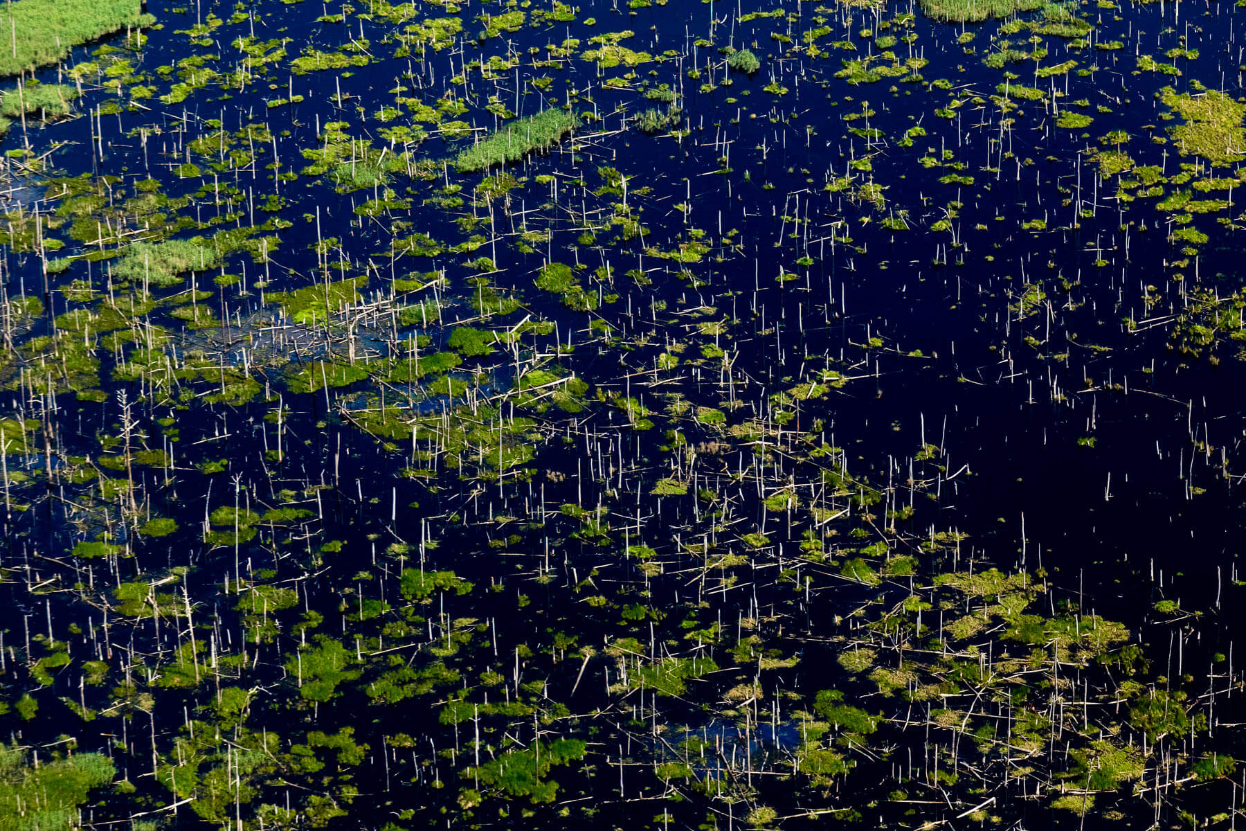 Dead loblolly pines cast shadows over salt marsh at Blackwater National Wildlife Refuge in Dorchester County, Md., on June 5, 2018. Sea level rise and land subsidence result in brackish water intruding on forested land and killing trees. A study by the Virginia Institute of Marine Science shows that roughly 100,000 acres of coastal forest in the Chesapeake Bay region have died since the 1850s—about half what once existed. (Photo by Will Parson/Chesapeake Bay Program)