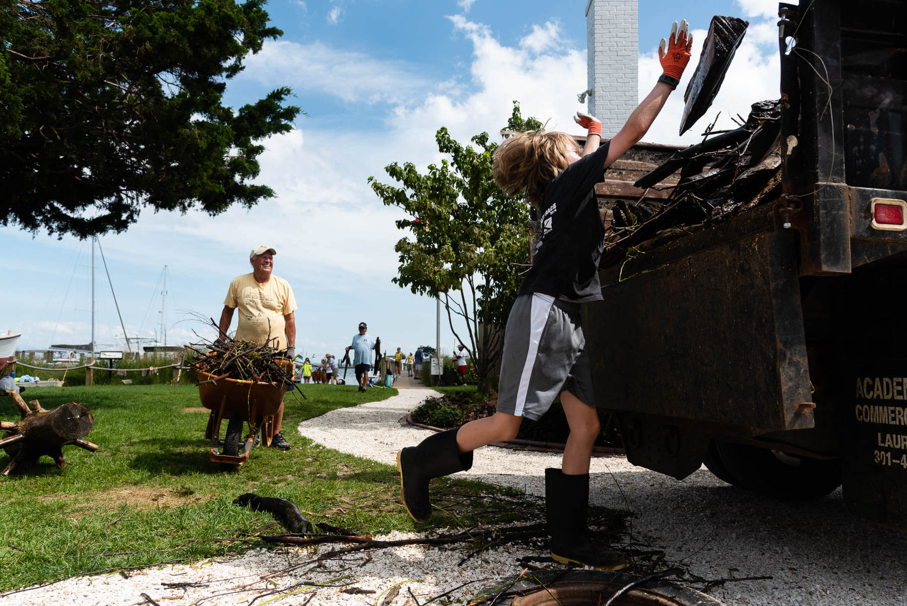 Following heavy rainfall, Max Shaffer, 10, disposes of driftwood collected by volunteers along the shoreline at the Annapolis Maritime Museum during a cleanup of debris released by the opening of floodgates at Conowingo Dam earlier in the week, in Annapolis, Md., on Aug. 2, 2018. (Photo by Kaitlyn Dolan/Chesapeake Bay Program)