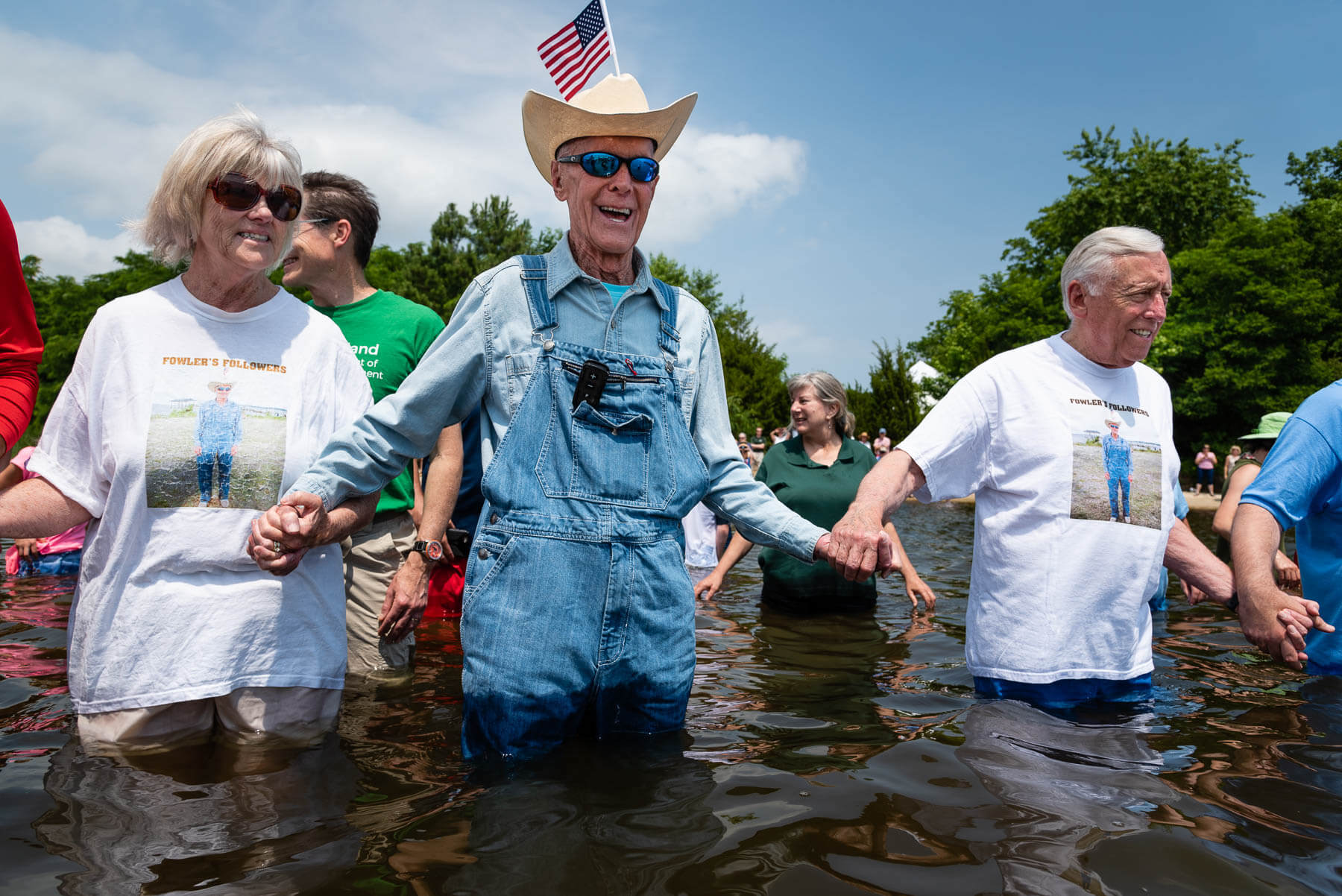 Bernie Fowler smiles as he wades into the Patuxent River during Bernie Fowler's 31st annual Wade-In at Jefferson Patterson Park in Calvert County, Md., on June 10, 2018. (Photo By Kaitlyn Dolan/Chesapeake Bay Program)