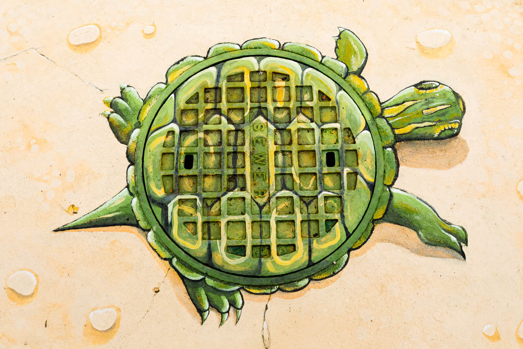 “Turtle” by artist Nessar Jahanbin decorates a storm drain in Washington, D.C., one of 20 designs chosen in a contest by the nonprofit @AnacostiaWS, seen on Feb. 13, 2018. The mural was funded by the Carter Family Foundation and a D.C. Department of Energy and Environment Community Stormwater Solutions grant. (Photo by Will Parson/Chesapeake Bay Program)