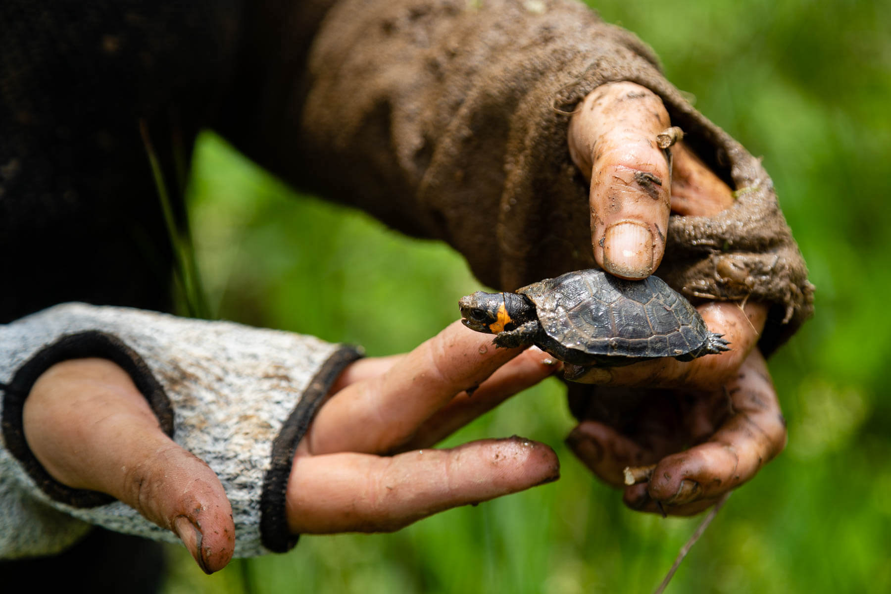 Environmental scientist Amy Nazdrowicz holds a one-year-old bog turtle she found while surveying a wetland habitat in Harford County, Md., on May 29, 2018. Bog turtles are North America's smallest turtle species but are a federally endangered species due to habitat loss and poaching for the pet trade. (Photo by Will Parson/Chesapeake Bay Program)