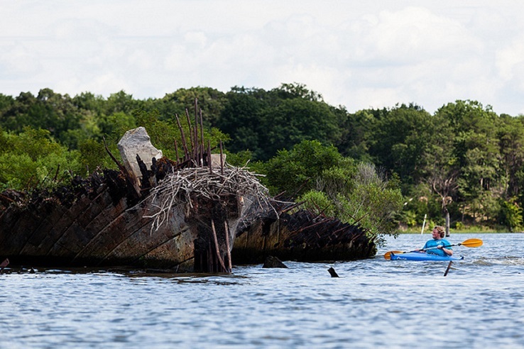 Mallows Bay along the Potomac River is home to more than 100 WWI steamboats, but they aren’t stored in a warehouse; they lie at the bottom of the Bay. Built as part of the U.S. Emergency Fleet between 1917 and 1919, they were meant to cross the Atlantic as part of the war effort. However, the war was ending as they were finishing construction, so they were sold, scrapped, burned or sunk at Mallows Bay.