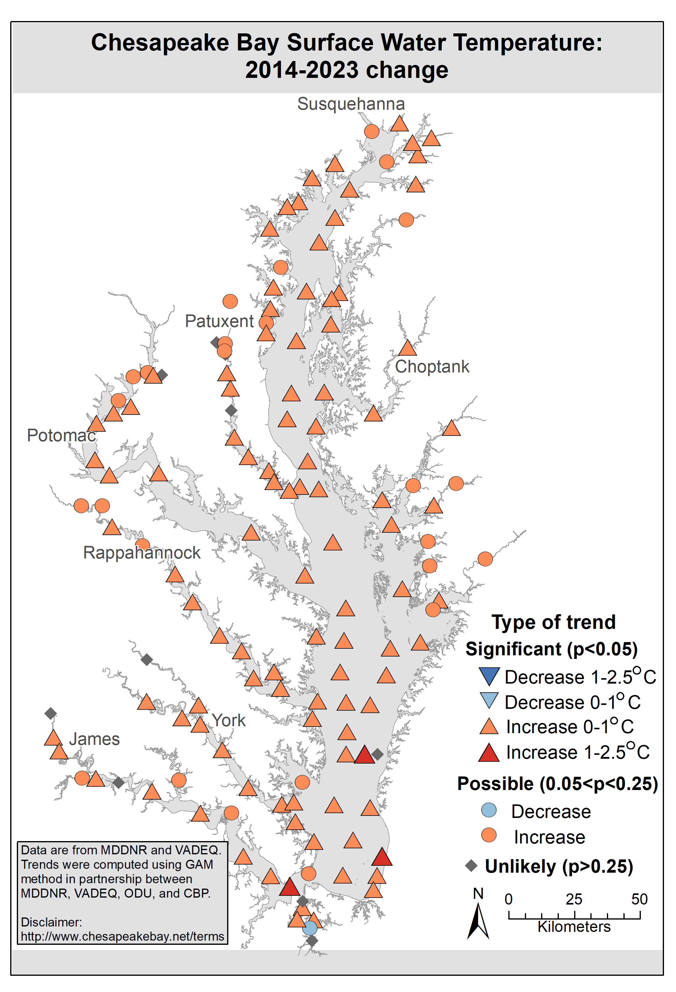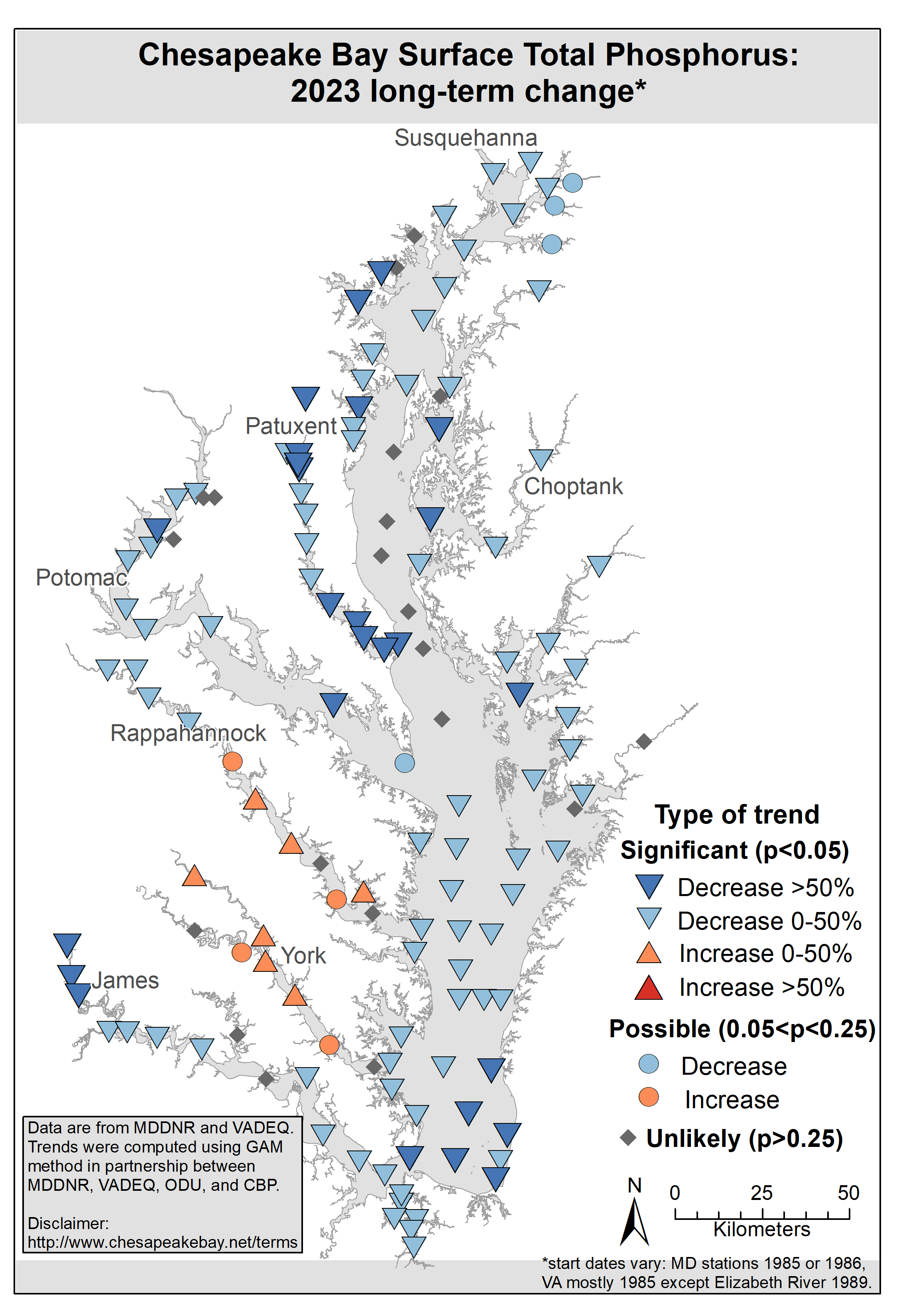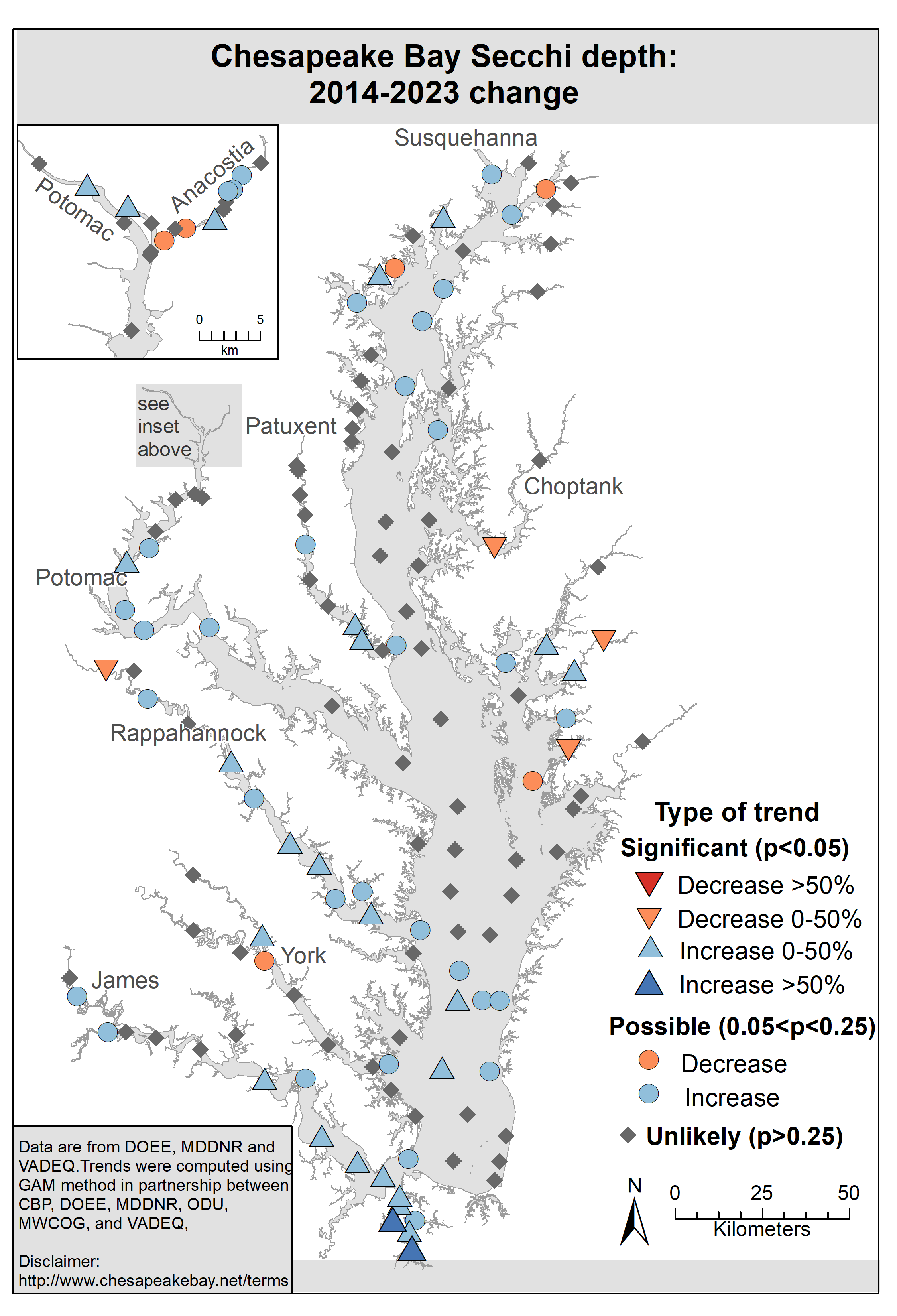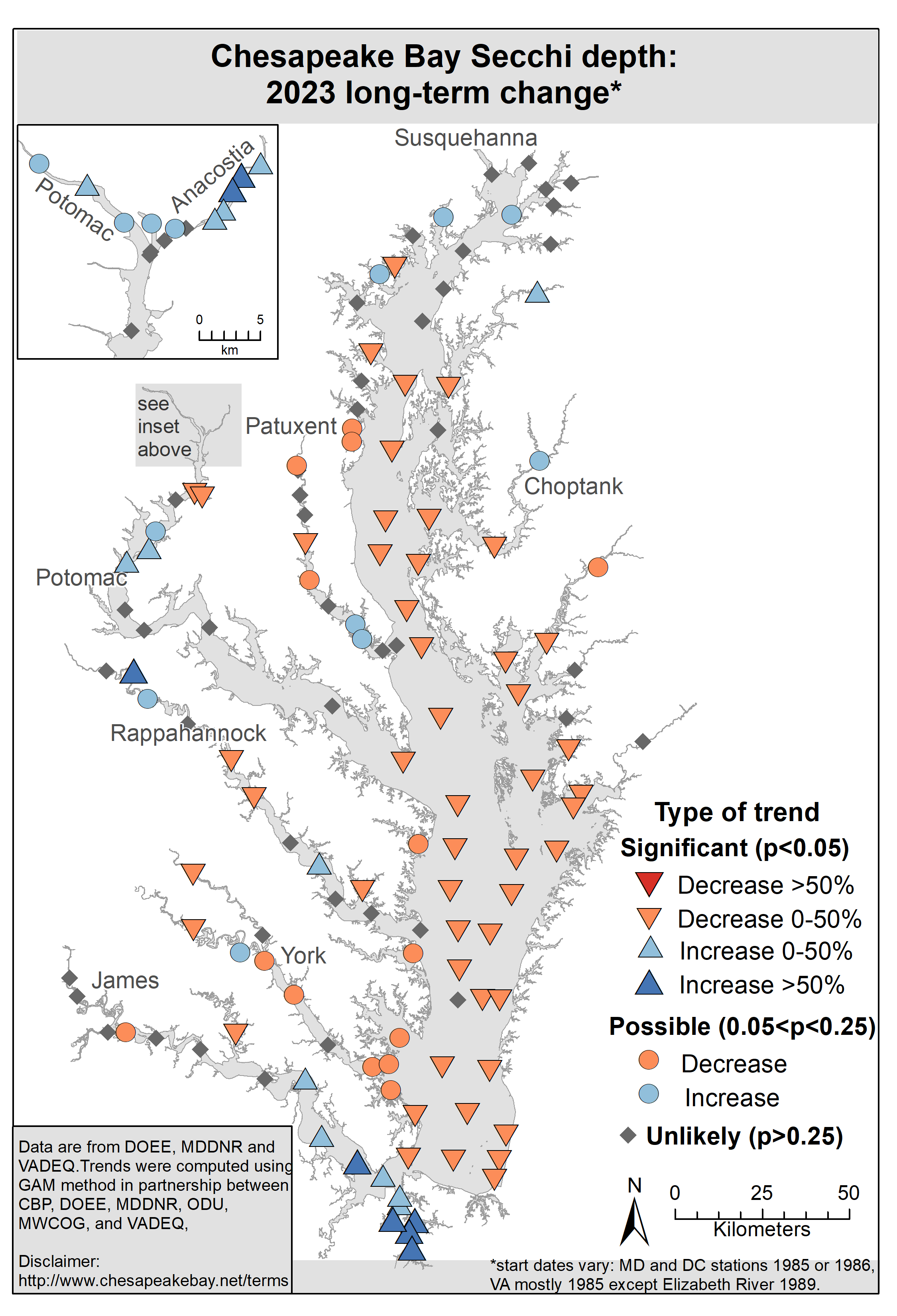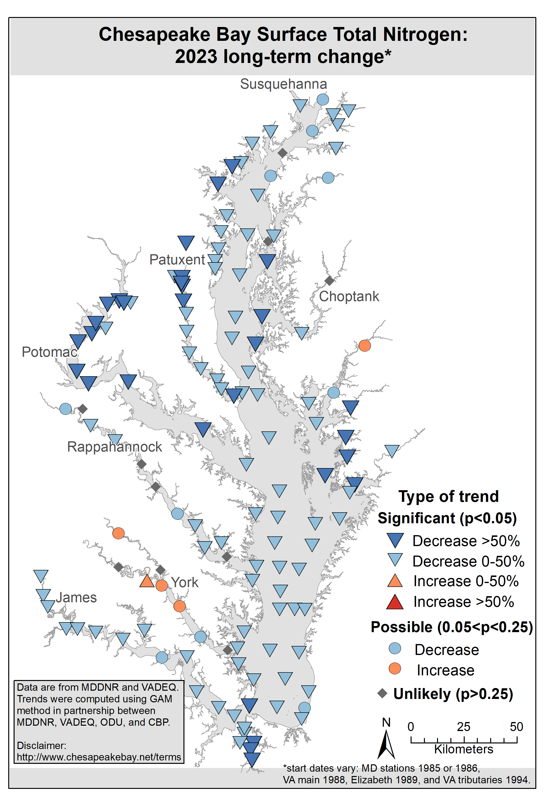 Change in water quality by station computed under the condition of average freshwater flow into the Chesapeake Bay over the long-term (through 2024).